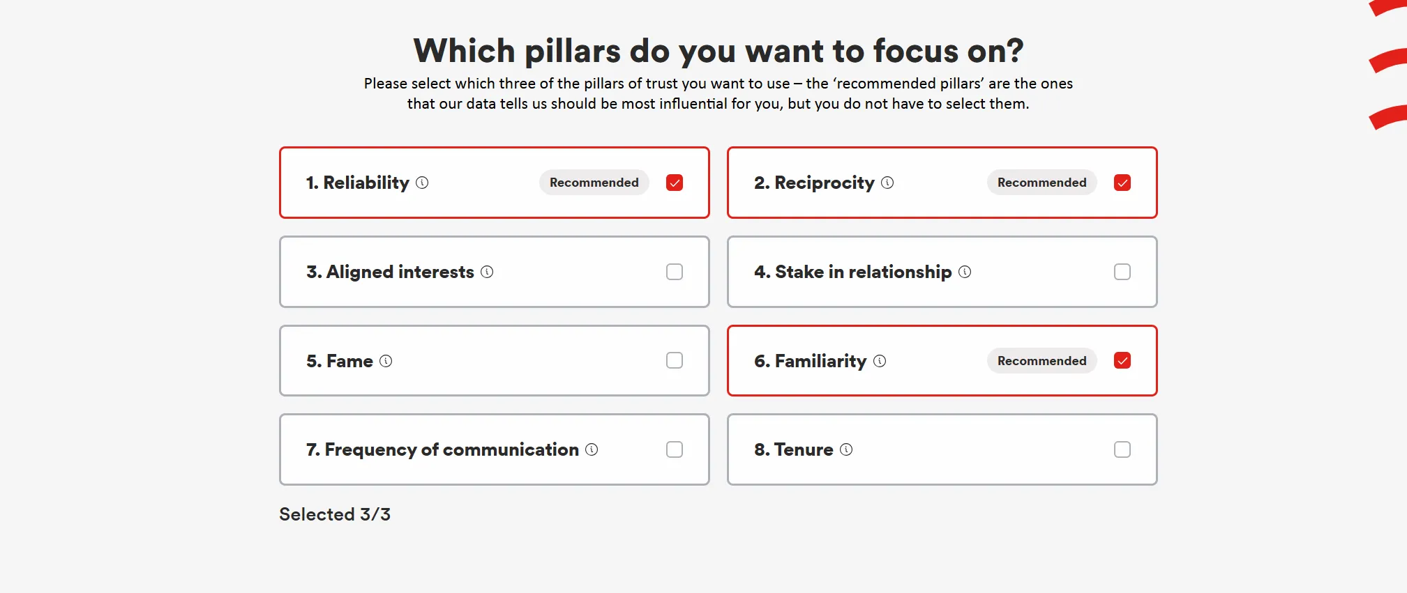 The tool will then make a recommendation as to which of the eight trust pillars will best serve the chosen objective, before giving a clear ranking of which communications channel or channels will meet that goal.