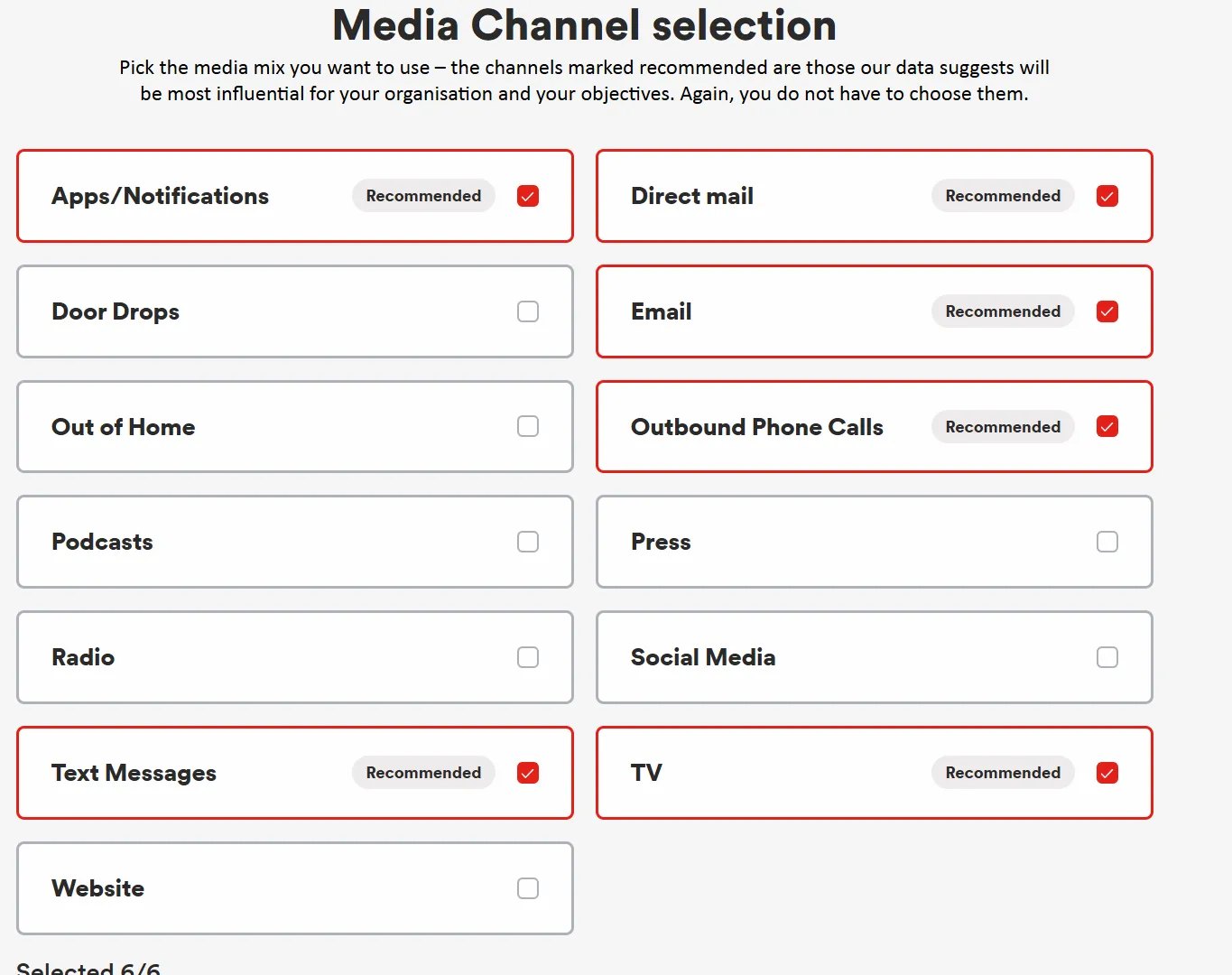 Then the tool recommends six channels that will best help with a campaign to meet the objective.